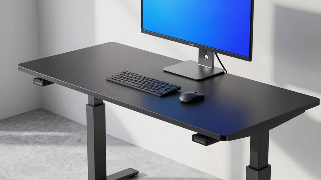 Built-in cable features are essential for maintaining a tidy and safe workspace with your electric standing desk. These features, like trays and hooks, help organize cords and prevent clutter. Integrated cable trays typically hold power strips and multiple cables, reducing tangling and potential damage. Pass-through cutouts or grommets allow cords to pass neatly into trays or behind the surface, keeping the workspace clean. Proper cable management not only enhances safety by minimizing tripping hazards and accidental disconnections but also improves overall aesthetics. A well-designed system makes it easier to access and adjust cables, contributing to a more productive environment. When choosing a desk, look for these built-in features to guarantee your workspace stays organized, safe, and visually appealing.