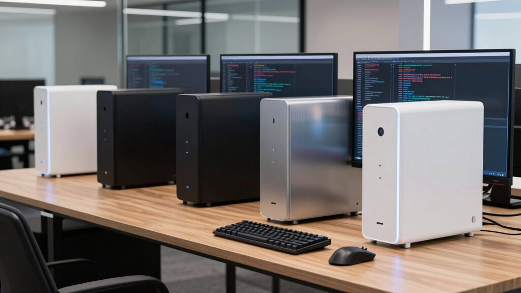 Choosing a small form factor PC for development work means paying close attention to its processing power and core count, since these directly influence how well the machine can handle multitasking and resource-intensive tasks. The number of cores impacts performance when running multiple IDEs, virtual machines, or containerized apps simultaneously. Higher core counts, especially with more threads, improve responsiveness and speed up compile times. It’s important to find a balance between core count and clock speed because more cores at lower speeds or fewer cores at higher speeds can affect performance depending on the workload. For demanding tasks, I recommend at least 4 to 8 cores, while lighter tasks might only need 2 to 4 cores. Prioritizing the right combination guarantees smooth, efficient development sessions in a compact machine.